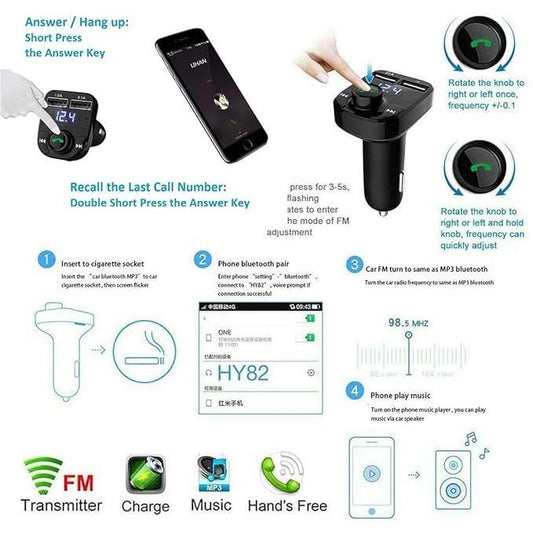 Hands-Free Wireless Bluetooth -Transmitter 2.1 A Dual USB Port